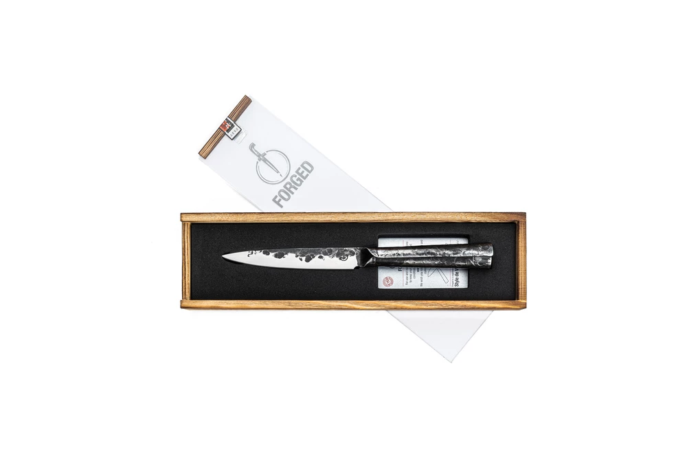 Alle Forged knivene lages for hånd og har en blad tykkelse på 2mm, med 18 graders vinkel. Leveres i en flott boks og har 10 års garanti.