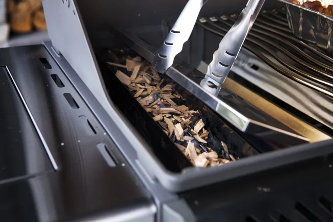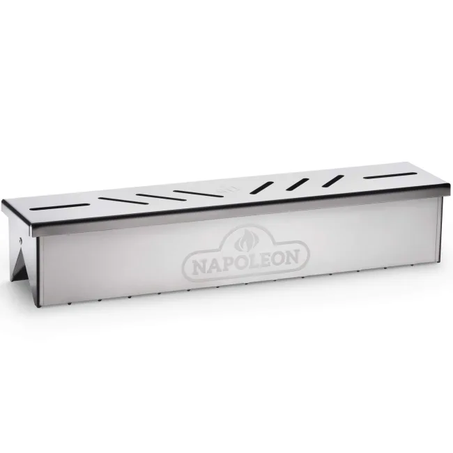 Røykerør som fylles med ønsket Napoleon røykflis og legges i grillen for utmerket røykeffekt. Plasser våte treflis inni røykerøret og legg det over venstre brenner og slå brenneren på.